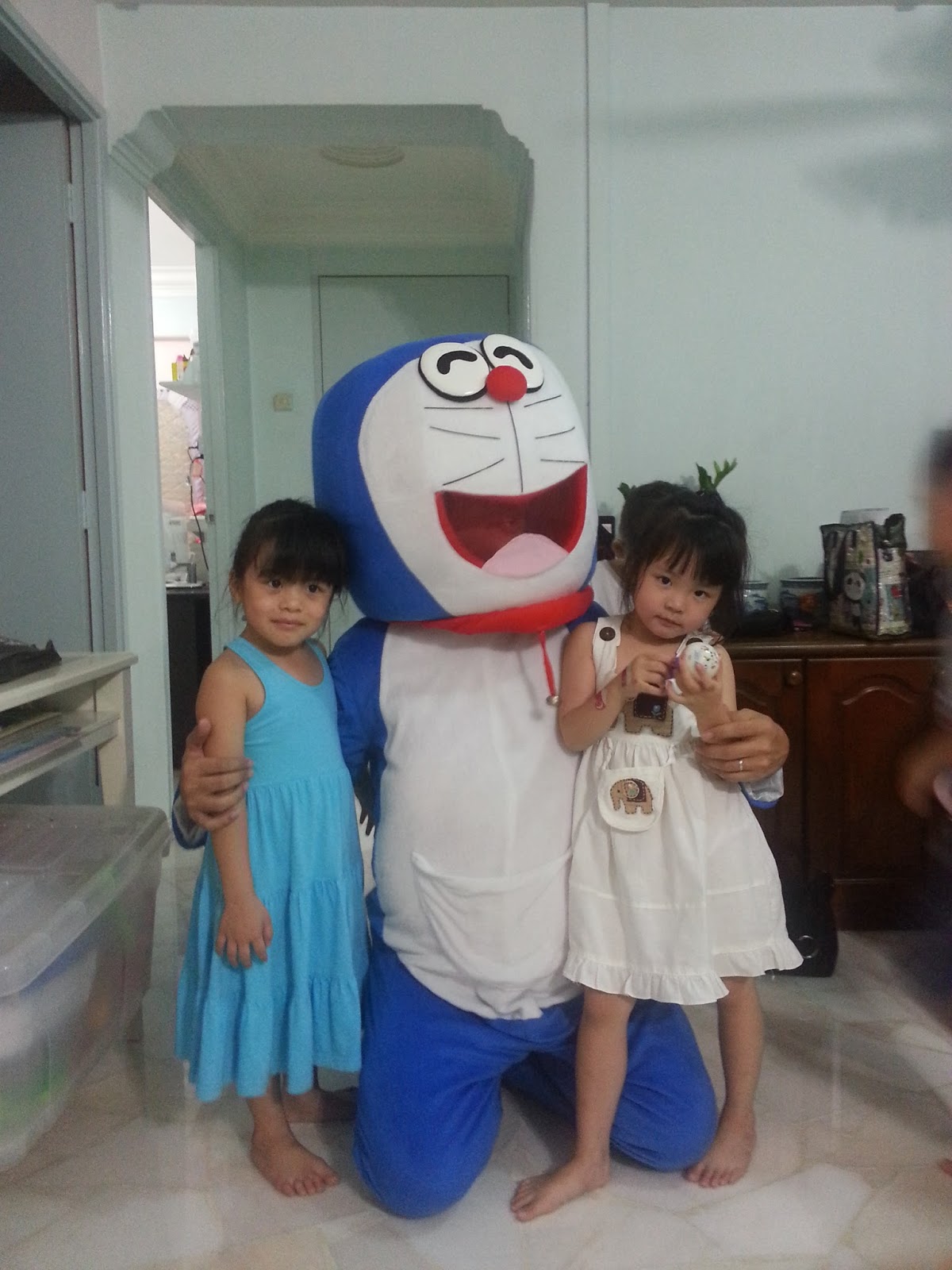 Indeed Klaire is a happy girl until Daddy showed up in the Doraemon mascot suit! (We borrowed the suit from Lexter cos he loan it for his proposal to Gigi! Such great timing!) The kids were overjoyed!Only Klaire was sobbing as she was afraid. Then we have to call off the idea of wearing the suit to class..lol